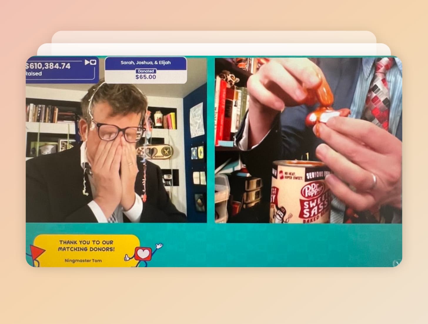 One of these elements is the ability to claim “perks” in exchange for donations. Each year’s perks include reliable favorites like exclusive podcast episodes and commemorative coins but also one-of-a-kind artwork, at times inspired by inside jokes from the stream.